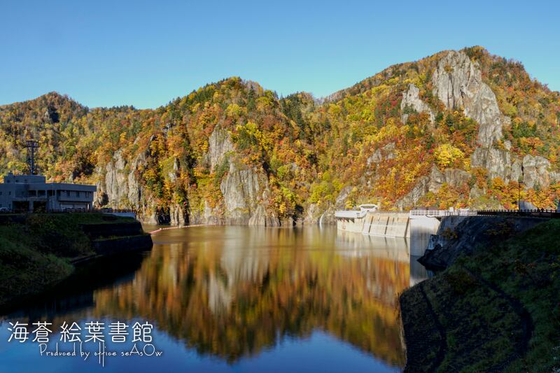 風のない鏡面のようなダム湖に、山々の紅葉がくっきりと映りこんでいました